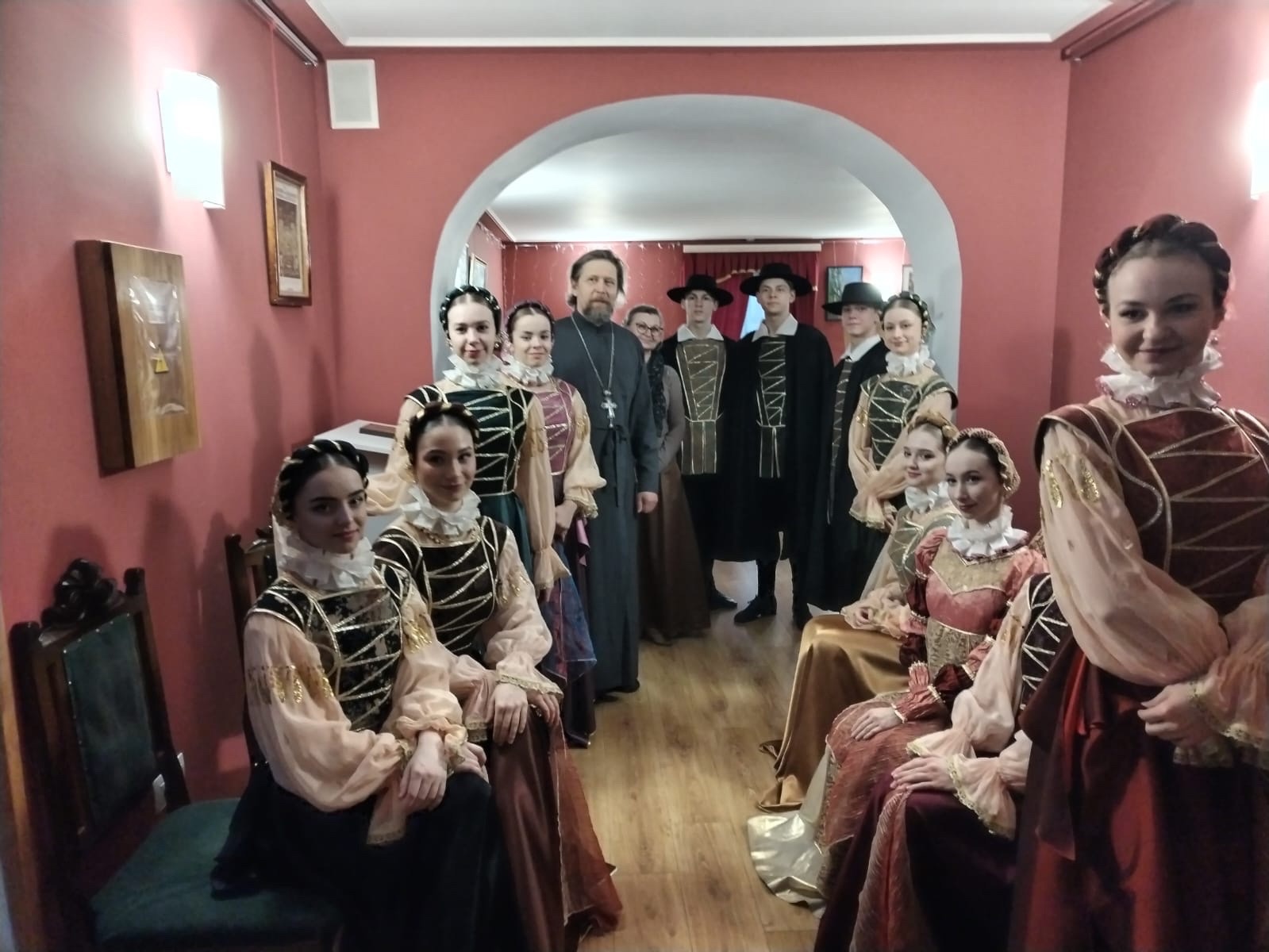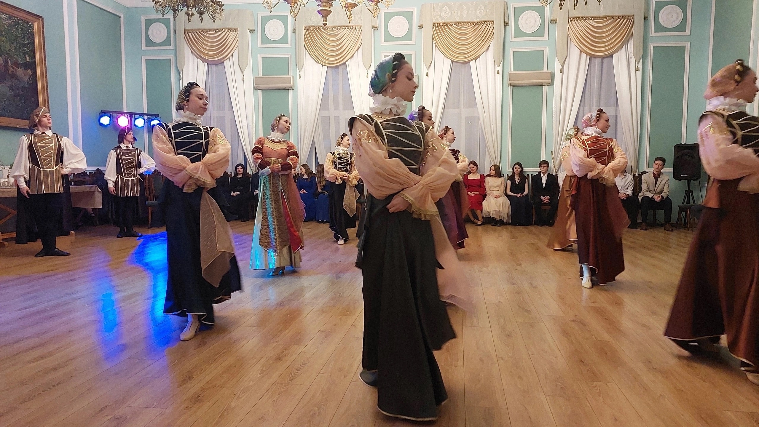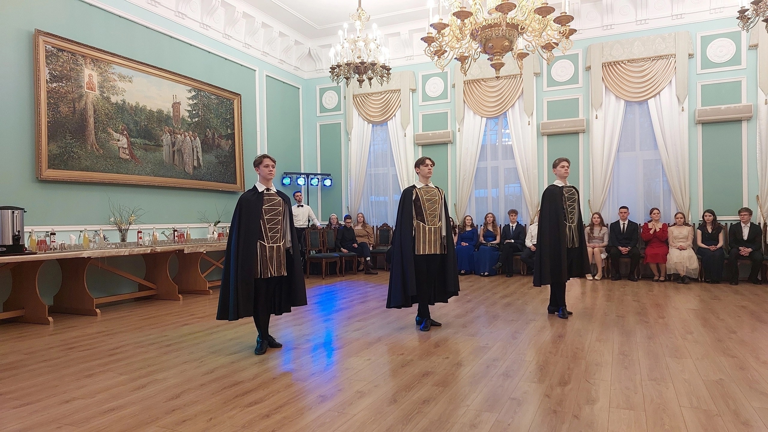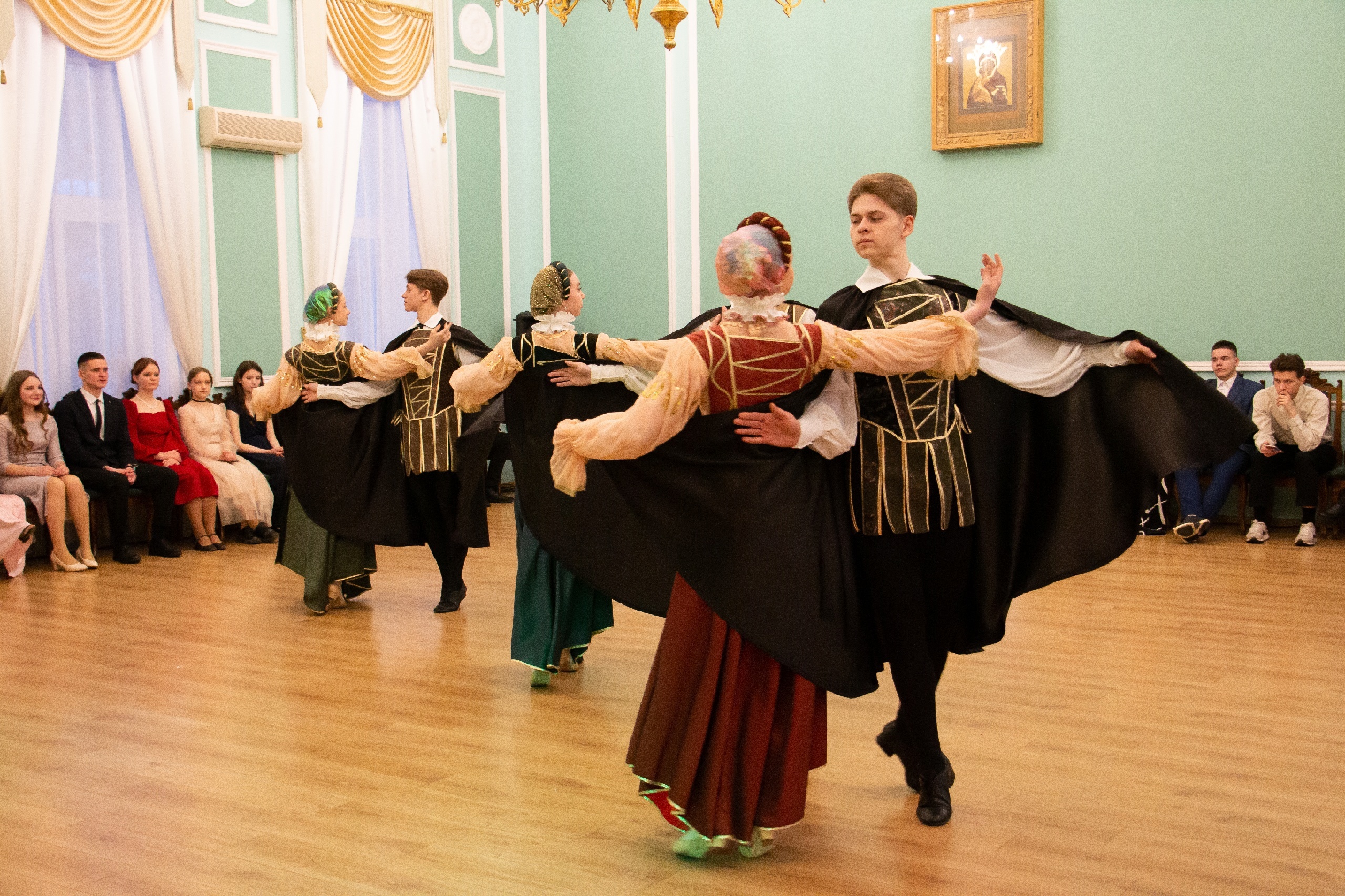 Выступление студентов IV курса хореографического колледжа помогло создать удивительную атмосферу бала эпохи Возрождения. В их исполнении были представлены танцы, изученные на дисциплине «историко-бытовой танец» (преподаватель - Лариса Анатольевна Волынская) «Танец рыцарей», «Гавот», «Полька - Анна».